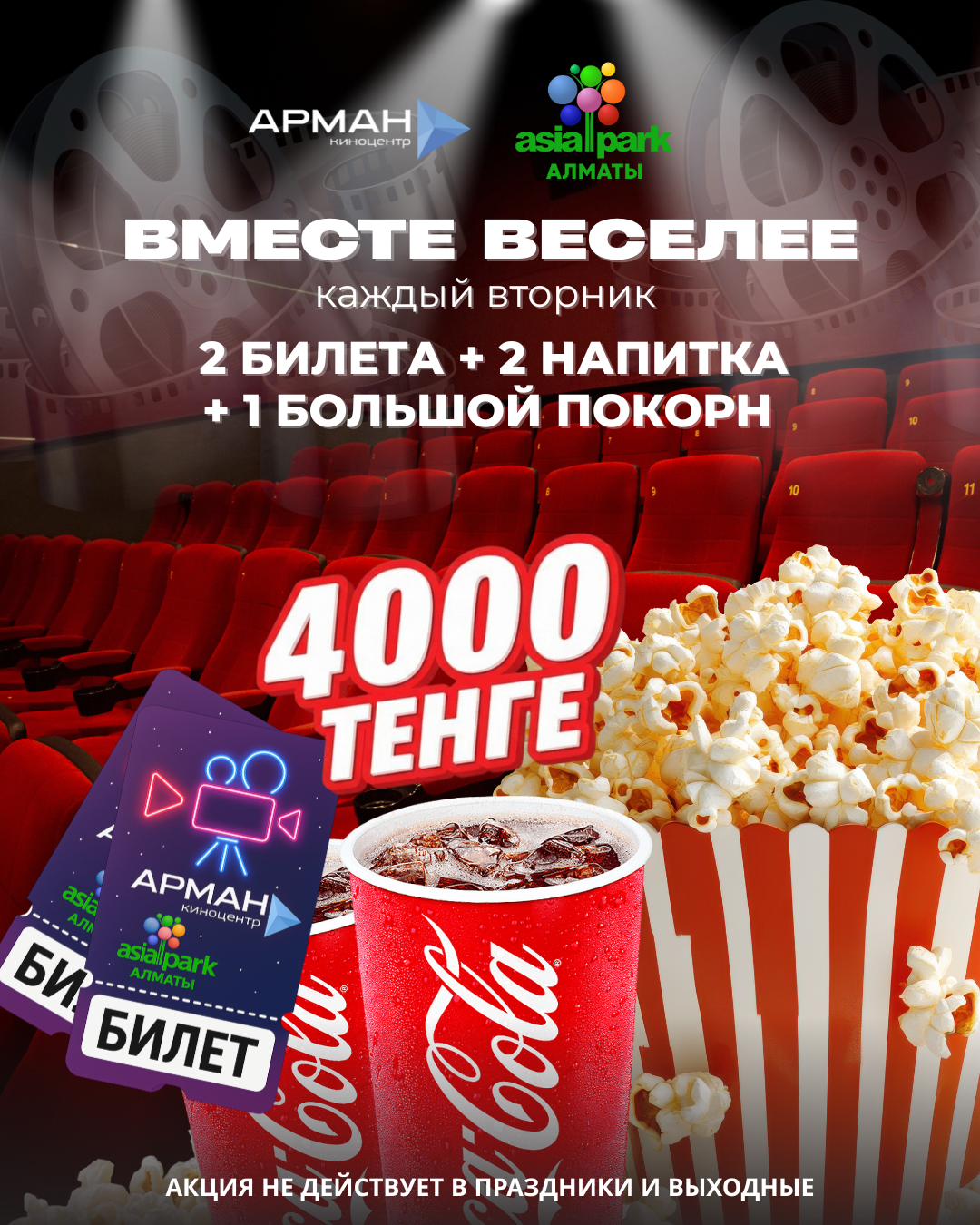 Акция действует каждый вторник и только в Киноцентре «АРМАН», расположенном в ТРЦ «Asia Park»!